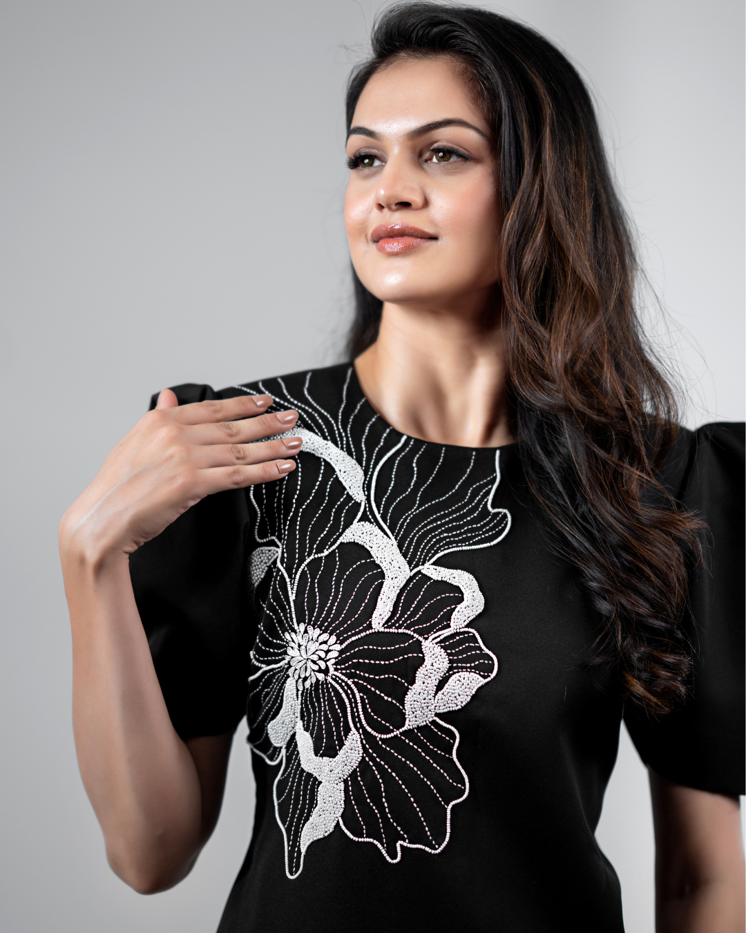 The floral detail on this dress adds a subtle point of interest while keeping the overall look clean and balanced. The design feels composed without being heavy, making it comfortable to wear through long evenings.