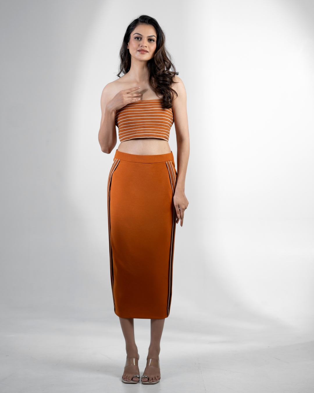 This is the outfit to pick when you want every part of your look to match but still feel relaxed. The set stays true to earthy tones with a striped bandeau and high-waisted pants in copper, pulled together by a tailored jacket. A striped scarf ties it all in and adds just a bit of fun. You can wear the pieces together or mix them with other basics, and it always reads sharp without being too much. It’s ideal for days when you don’t want to think too hard but want to look good from morning to night.