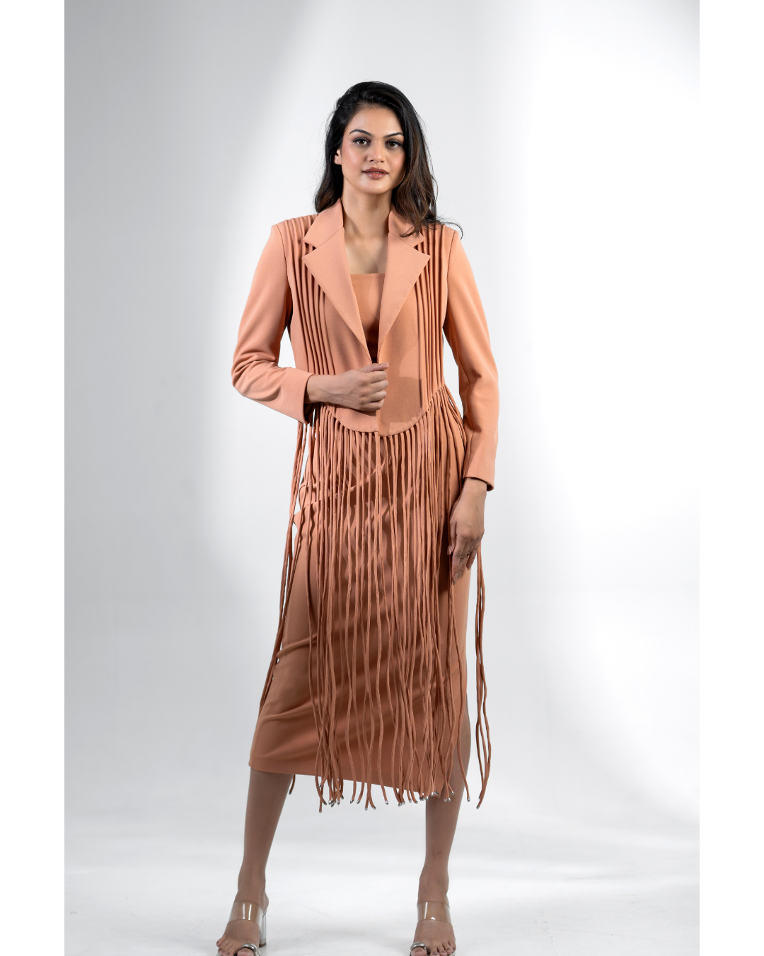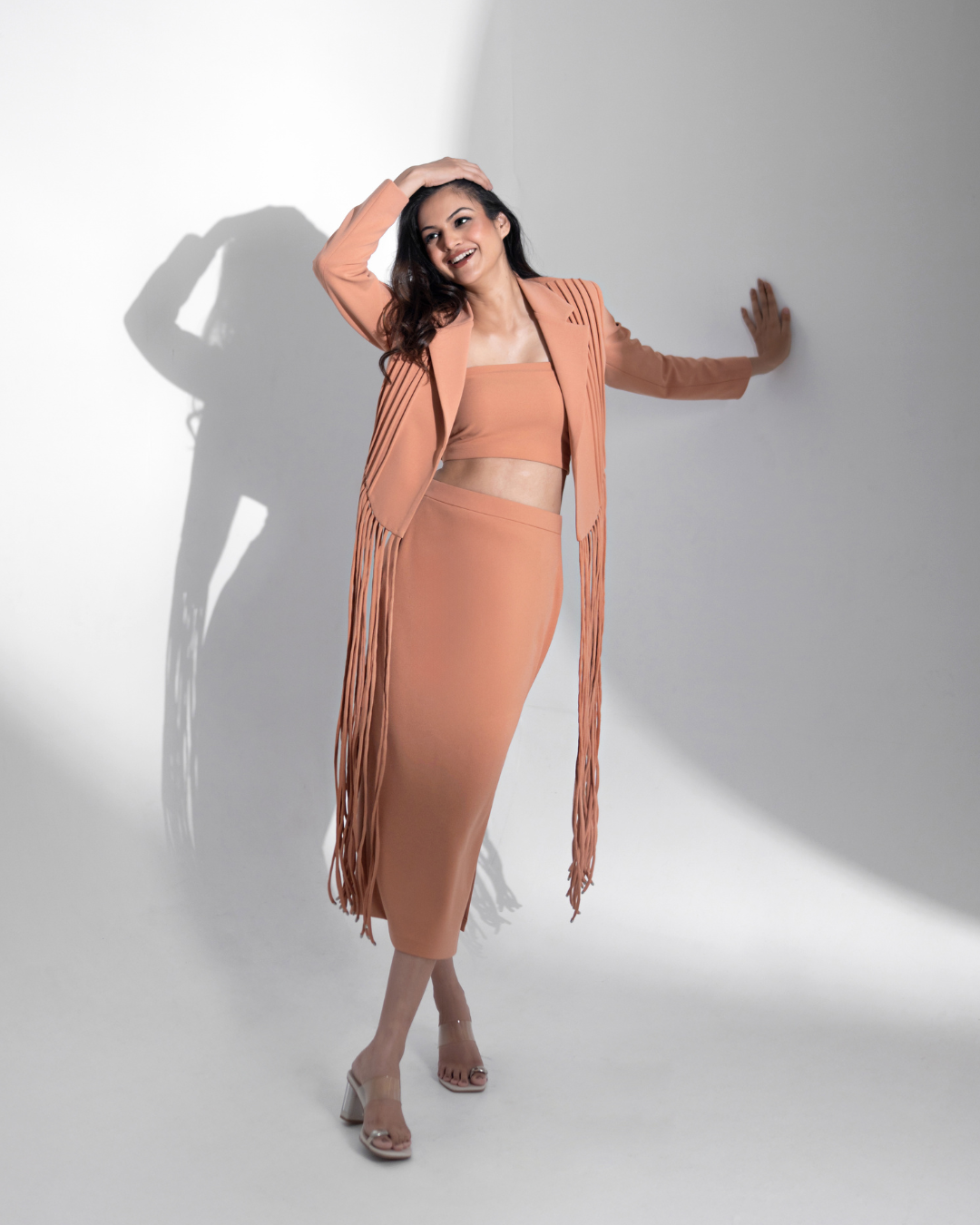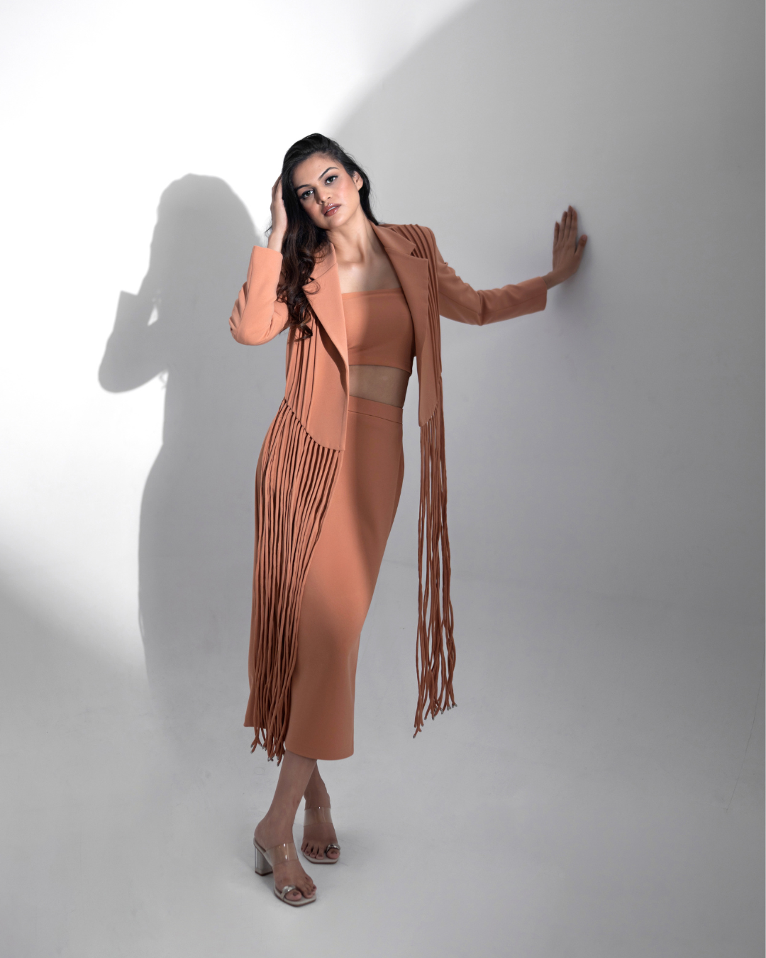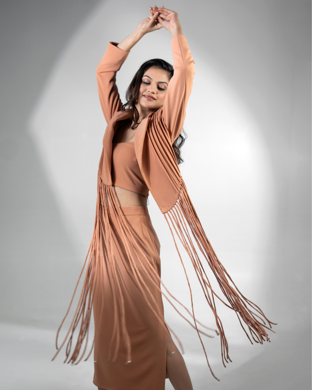Ignite is for the days you want a clean look but still make a statement. The jacket brings in structure without feeling formal, while the long fringe moves and stands out against the soft nude color. Paired with a matching top and skirt, this set steps easily from meetings to evenings out. You get a coordinated feel, but everything stays comfortable and fuss-free. It’s subtle drama for work or dinner, all in one.