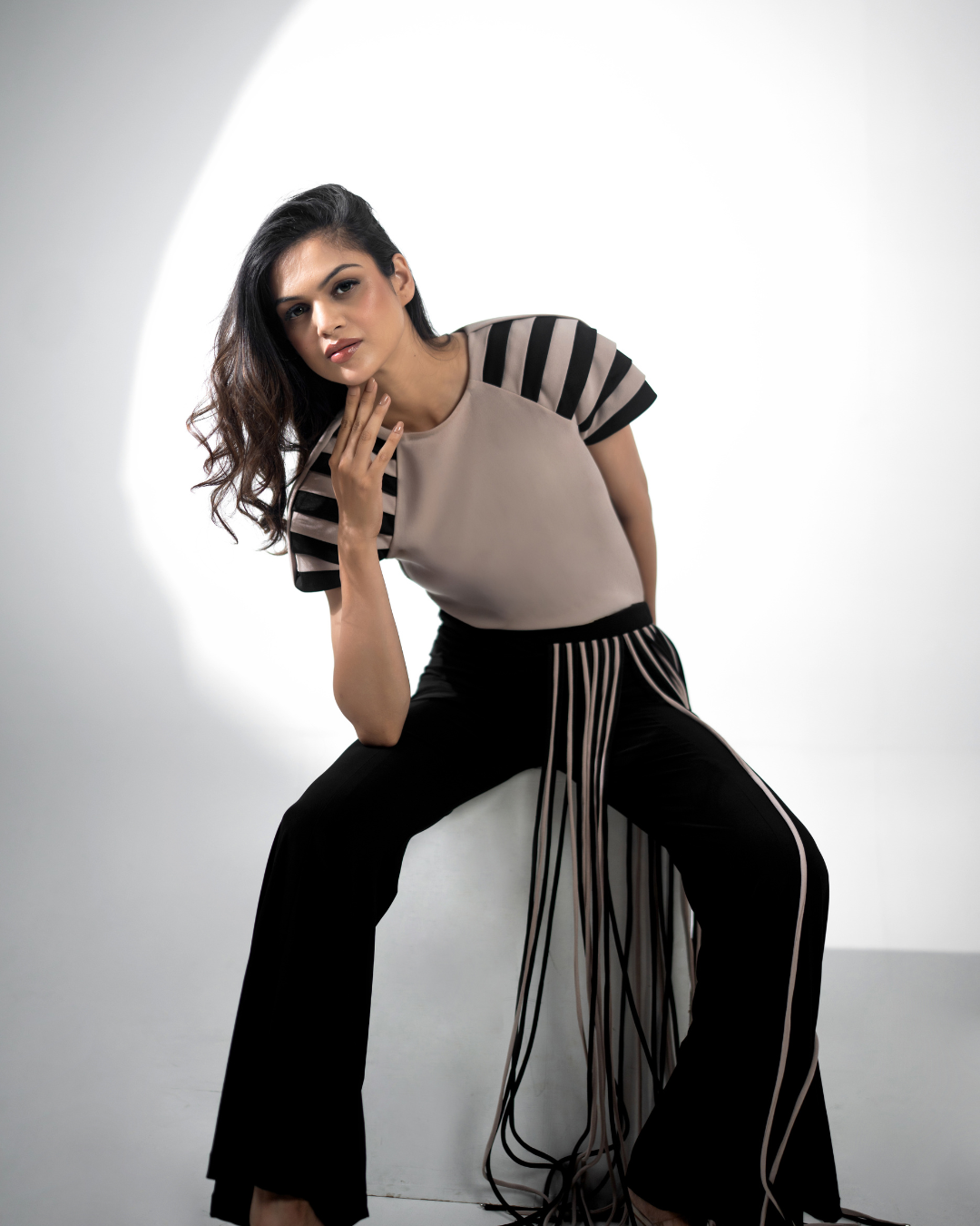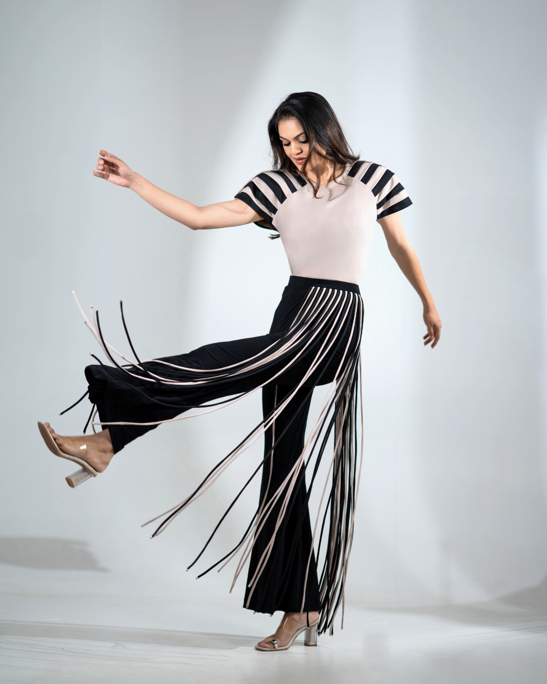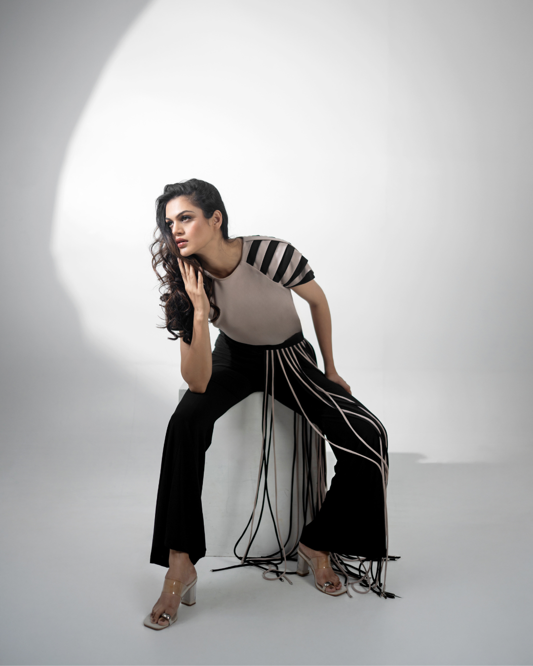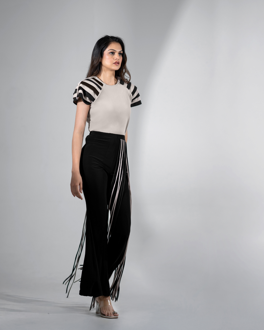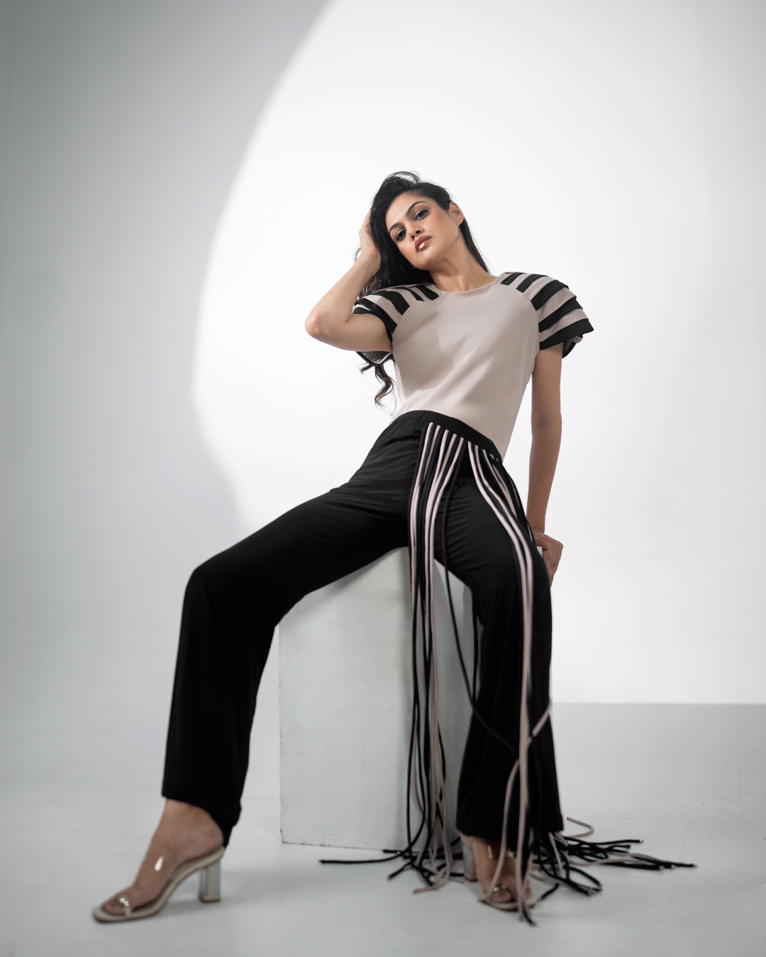 Nude Noir is for when you want to keep things smart but with some movement. The soft nude top has bold striped sleeves, while the pants flow out and finish with matching fringe. Everything sits easy and works just as well at work as it does for a night out. The set blends neutral tones with strong lines, so you get that stand-out feel without being loud. This is the outfit for showing up polished but relaxed.